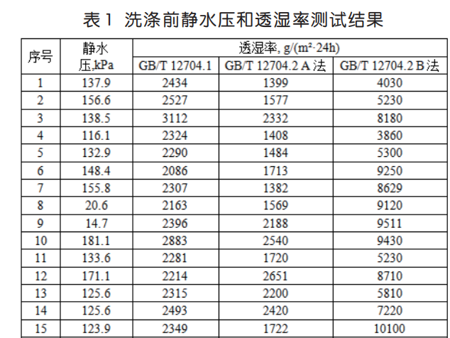 以筆者所在的檢測機(jī)構(gòu)為例,收集了一定時(shí)間內(nèi)的沖鋒衣面料檢測樣品,共計(jì) 50 個(gè),其中 35 個(gè)樣品采用上述方法,進(jìn)行靜水壓和透濕率測試,研究不同方法之間的關(guān)系,結(jié)果見表 1。15 個(gè)樣品按照GB/T 32614-2016《戶外運(yùn)動(dòng)服裝 沖鋒衣》測試比較樣品洗滌前、后的靜水壓和透濕率變化,結(jié)果見表 2。