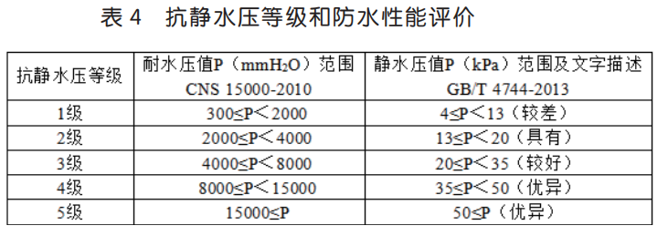 可見,防水透濕面料倒杯 - 蒸發(fā)法的透濕率基本符合正態(tài)分布,≤ 4000g/(m2·24h)的比例為10.0%,> 10000g/(m2·24h)的比例 10.0%,一半以上測試結(jié)果集中在 5000~ 9000 g/(m2·24h)。而靜水壓測試結(jié)果相對(duì)比較分散,≤ 30kPa 的比例為 16.0%,> 170kPa 的比例為 12.0%,70% 以上的測試結(jié)果大于 70kPa。以 GB/T 32614-2016《戶外運(yùn)動(dòng)服裝 沖鋒衣》中對(duì)沖鋒衣面料 I 級(jí)功能性要求而言,即洗滌前透濕率≥ 5000g/(m2·24h),靜 水 壓 ≥ 50kPa,50 塊 面 料 透 濕 率 合 格 率 為84.0%,靜水壓合格率為 82.0%,合格率基本一致。但靜水壓指標(biāo)相對(duì)更好,三分之二的樣品靜水壓> 100kPa,遠(yuǎn)遠(yuǎn)滿足標(biāo)準(zhǔn)要求,這也驗(yàn)證了靜水壓指標(biāo)通過在織物表面的涂層處理很容易符合標(biāo)準(zhǔn)要求。將 GB/T 4744-2013《紡織品 防水性能的檢測和評(píng)價(jià) 靜水壓法》及臺(tái)灣標(biāo)準(zhǔn) CNS 15000-2010《防水透濕紡織品性能評(píng)估》[8] 對(duì)靜水壓的評(píng)價(jià)性能列如表 4 所示。