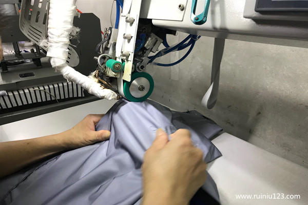 像是沖鋒衣的縫線會破壞防水效果,所以在沖鋒衣的全件各縫接處里布那里都會有壓膠層的。請看一下示意圖:【注:一下是思諾華工廠真實生產(chǎn)圖片】