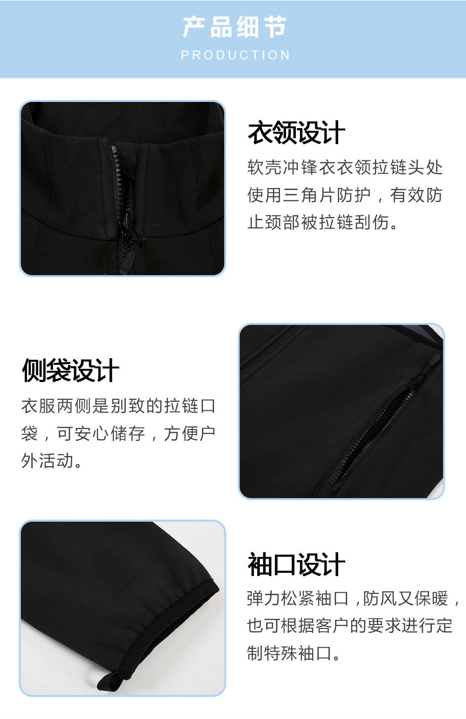袖口設計:彈力松緊袖口,防風又保暖,也可根據客戶的要求進行軟殼沖鋒衣定制其的特殊袖口。