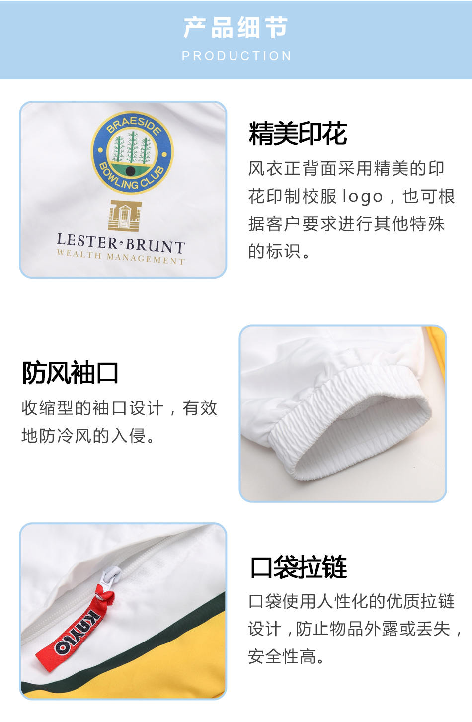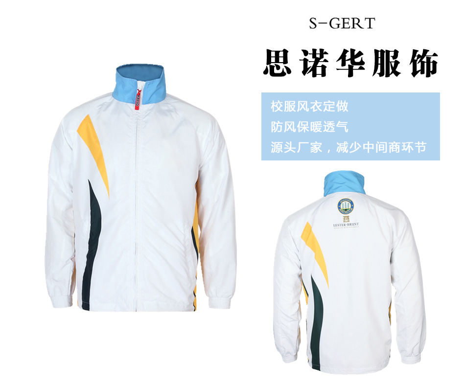 精美印花:風衣正背面采用精美的印花印制校服logo,也可根據客戶的需求進行校服風衣定制其特殊的標識。