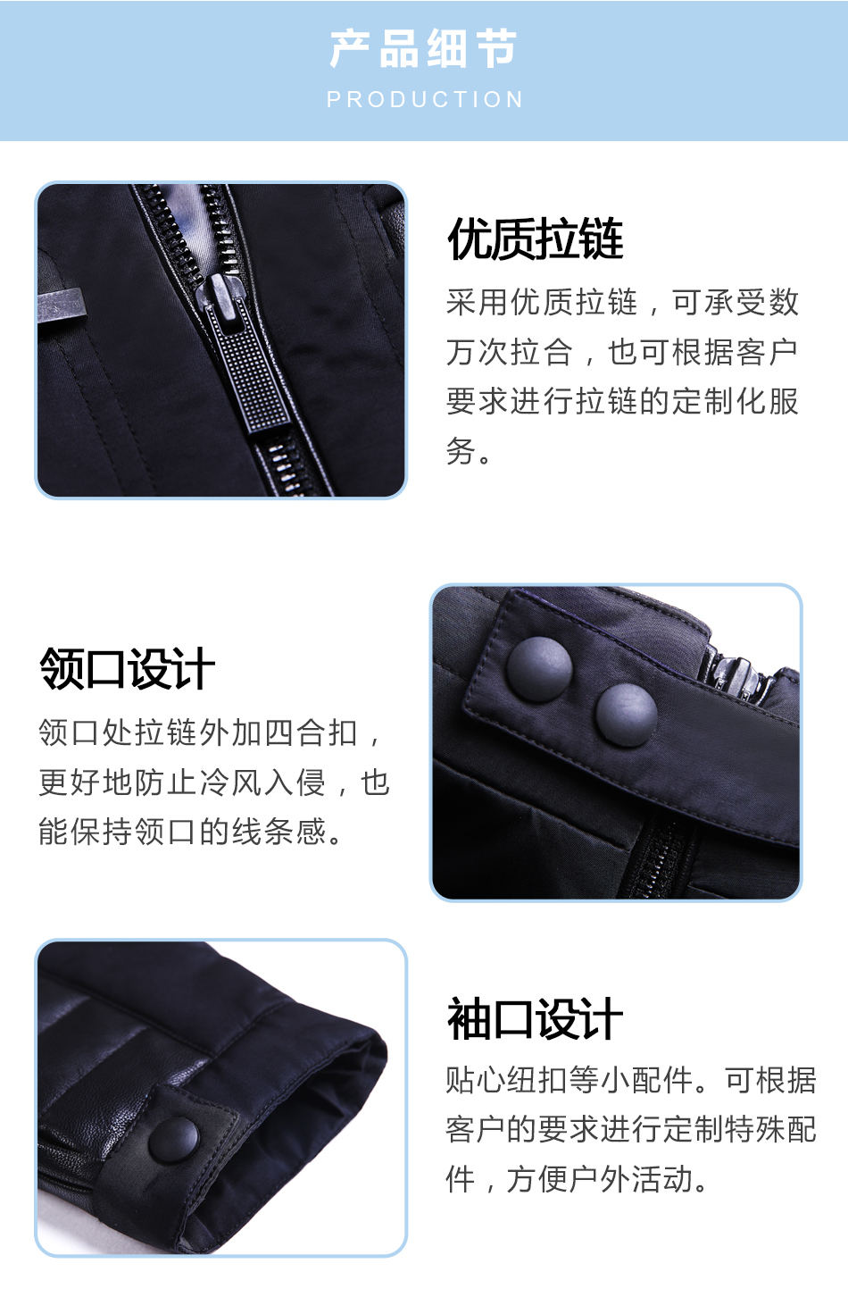 • 領口設計:領口處拉鏈外加四合扣,更好地防止冷風入侵,也能保持領口的線條感。