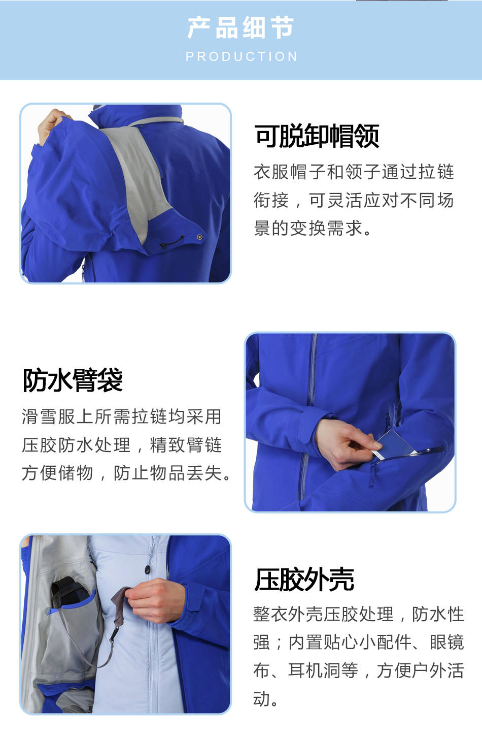 可脫卸帽領:衣服帽子和領子通過拉鏈銜接,可靈活應對不同場景的變換需求。