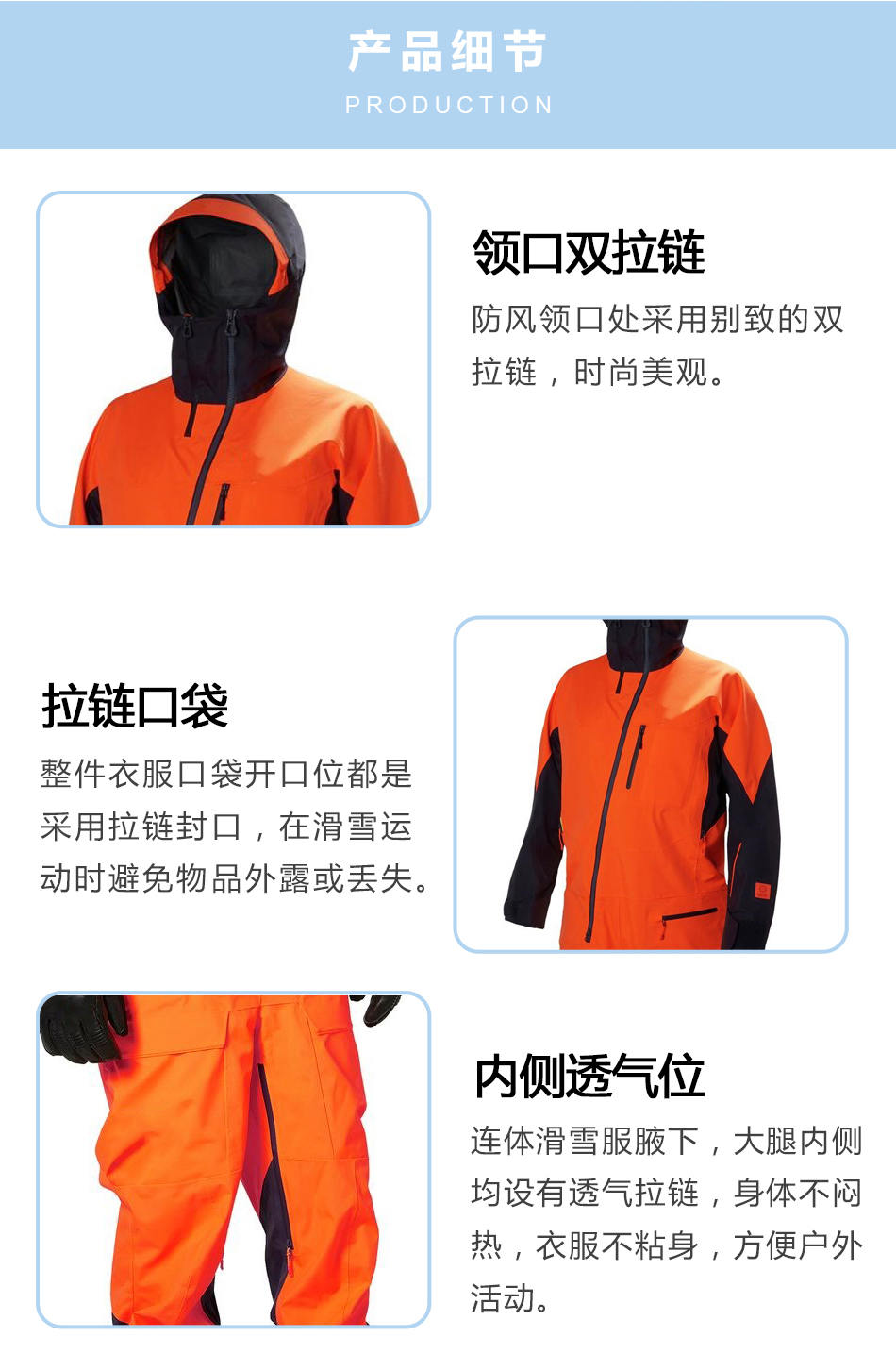 • 領(lǐng)口雙拉鏈連體滑雪服的防風(fēng)領(lǐng)口處采用別致的雙拉鏈,時尚美觀。